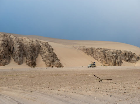 Flora and fauna thrive in surprising ways, supported by the cold Atlantic fog that rolls inland and sustains thousands of desert-adapted insects and plants. Along the rocky shoreline, Cape fur seals gather in large, noisy colonies - drawing in aerial predators like jaegers and skuas. Inland, avid birders can spot rare species such as Rüppell’s korhaan, Benguela long-billed lark, and tractrac chats.